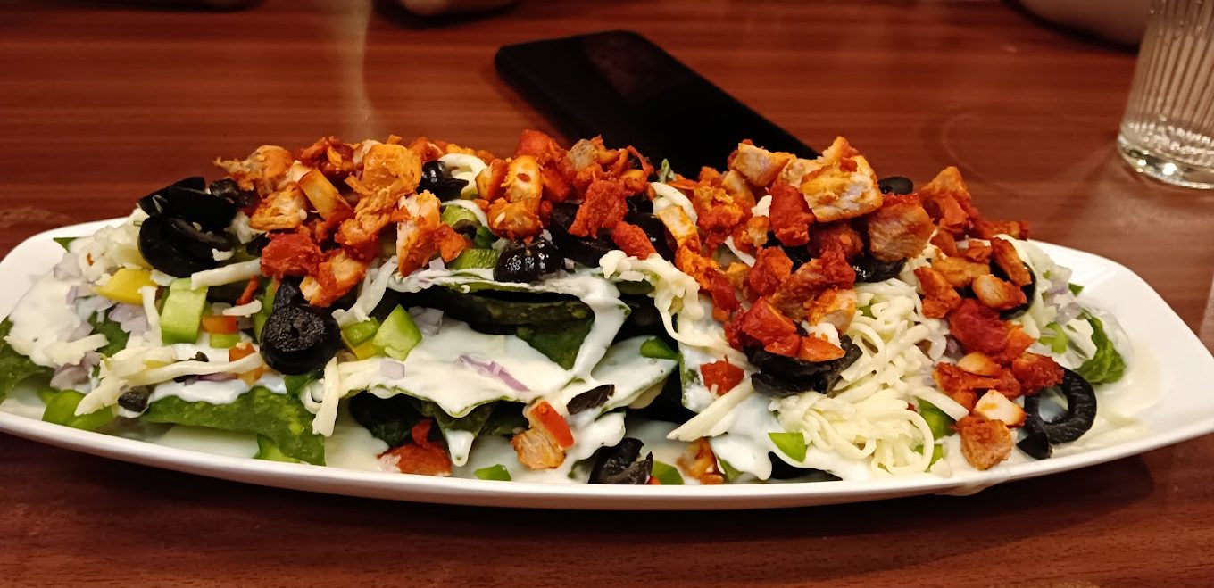 (Crispy spinach flavored nachos topped with bell peppers, spicy kidney beans, onion, black olives, shredded as well as melted cheese. Served with salsa & cheese sauce)